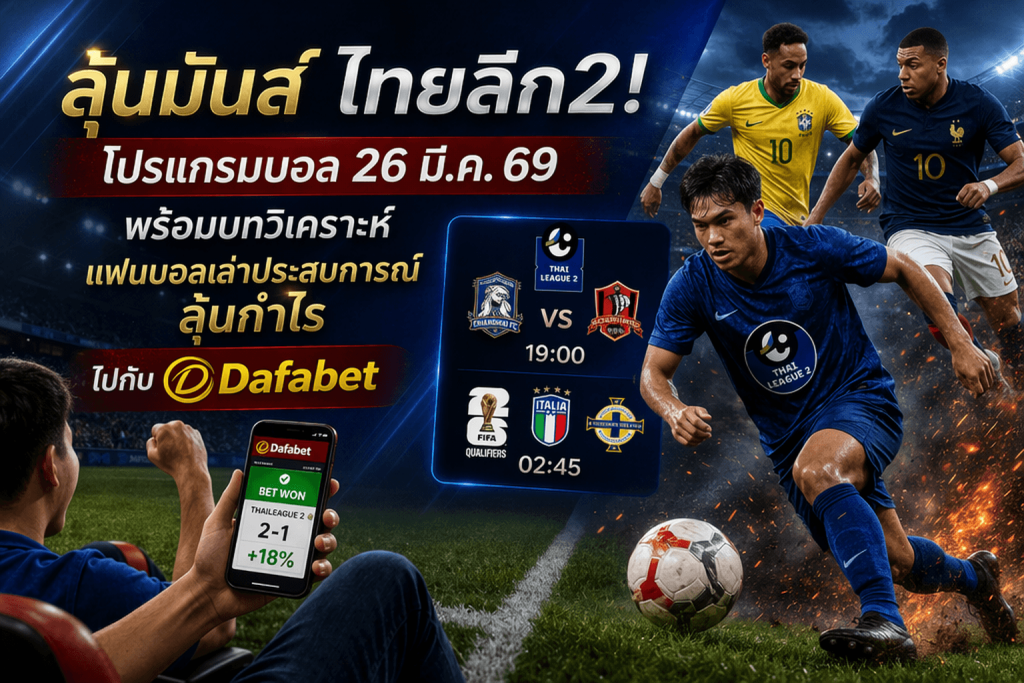 วันที่ 26 มีนาคม 2569 ถือเป็นอีกวันสำคัญของคอบอล โดยเฉพาะแฟน ไทยลีก2 ที่ติดตามฟอร์มทีมโปรดอย่างใกล้ชิด ขณะที่โปรแกรมทีมชาติและเกมยุโรปก็อัดแน่นเต็มวัน แต่สำหรับคนที่อินกับลีกรองของไทยอย่างแท้จริง “ไทยลีก2” ยังเป็นลีกที่ให้ความสนุก ดราม่า และโอกาสลุ้นเลื่อนชั้นแบบเข้มข้นที่สุด